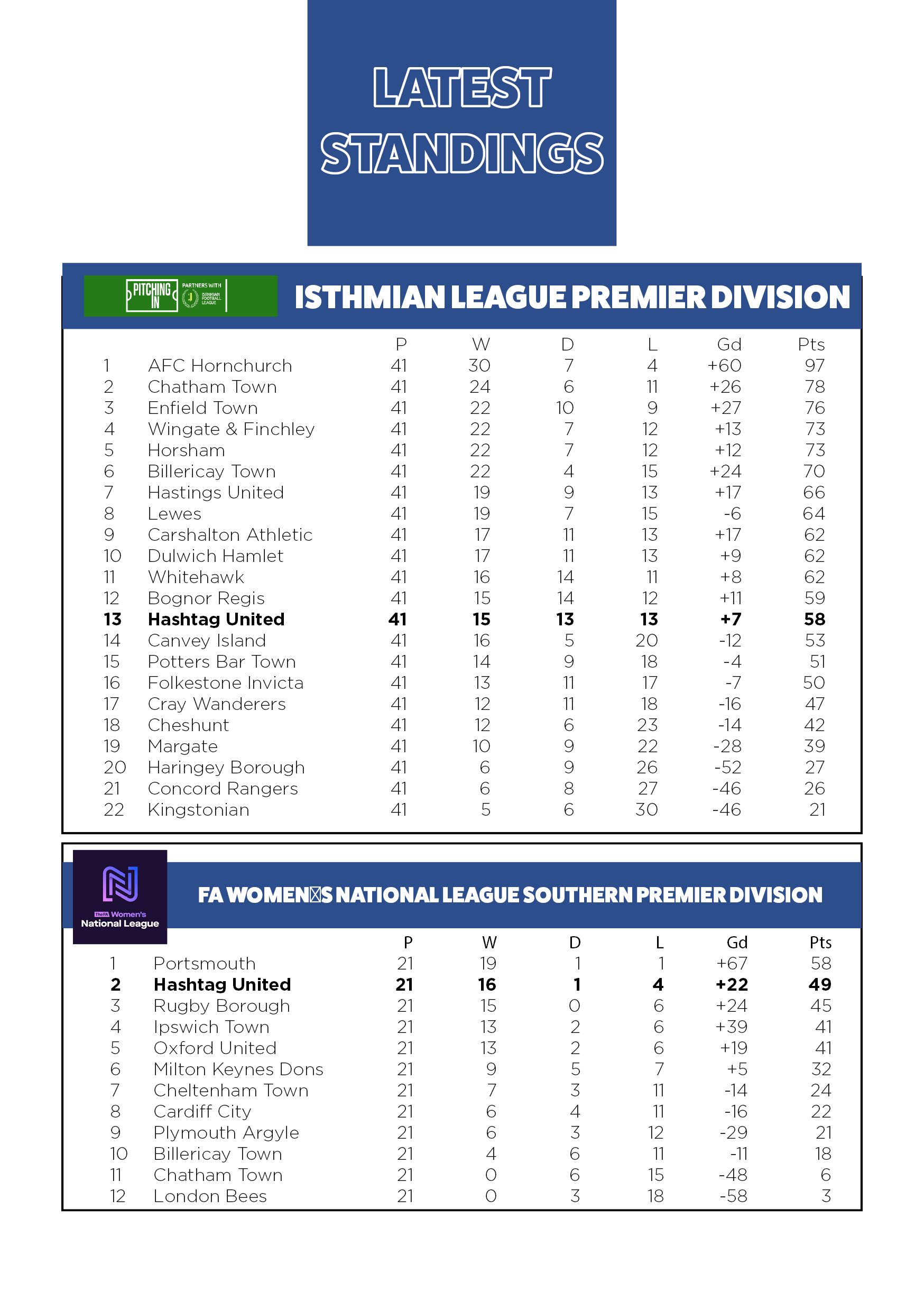 Between August 2023 and August 2024, I was responsible for updating the men's and women's league tables for the official Hashtag United matchday programmes.